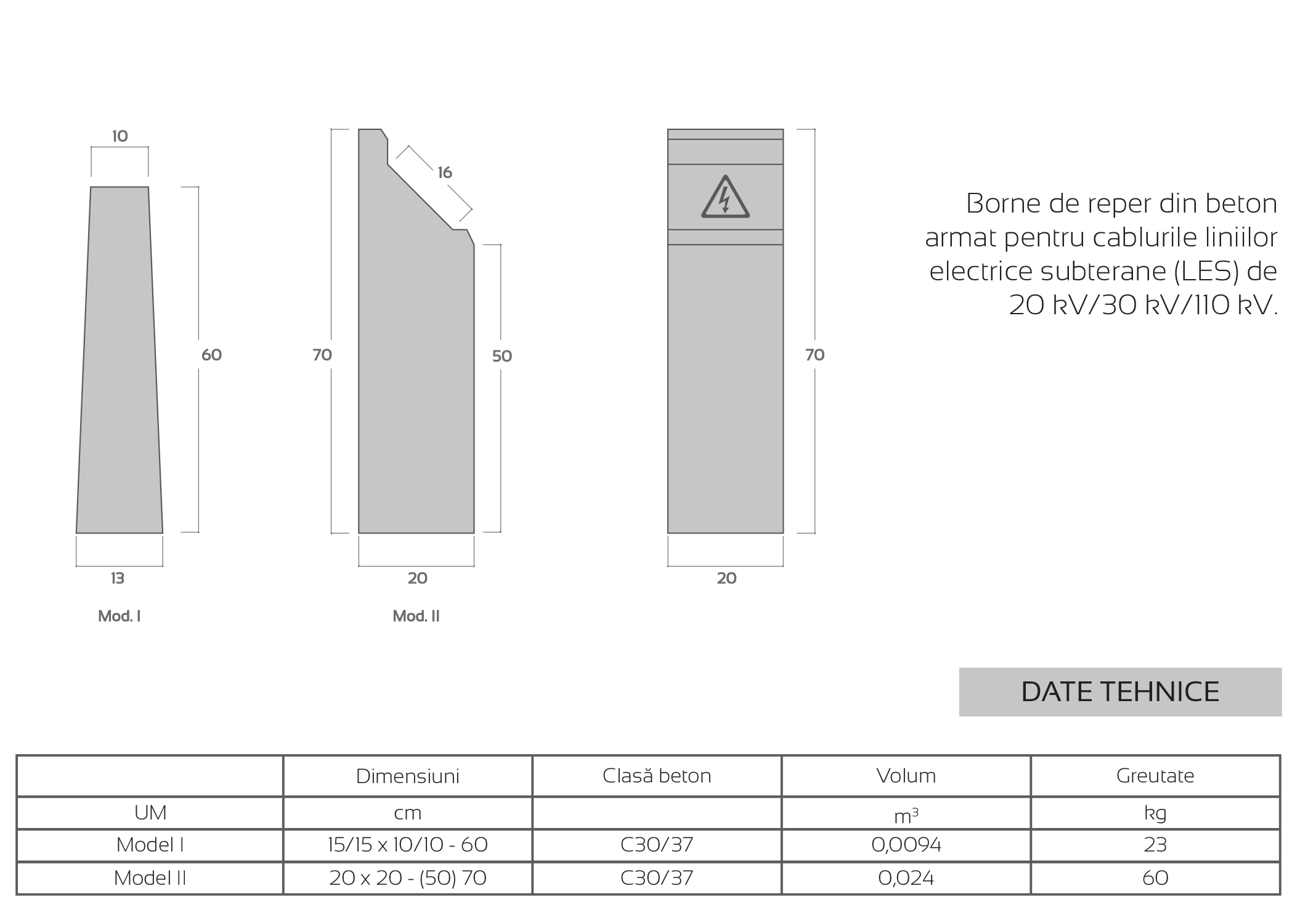 Disponibile în două modele principale, Modelul I are dimensiuni de 15/15 cm la bază și 10/10 cm la vârf, cu o înălțime de 60 cm, având un volum de 0.0094 m³ și o greutate de 23 kg. Modelul II are dimensiuni de 20 x 20 cm și o înălțime de 50 sau 70 cm, cu un volum de 0.024 m³ și o greutate de 60 kg. Aceste borne de reper sunt proiectate pentru a marca locația cablurilor LES și pentru a asigura o monitorizare eficientă și protecția acestora în rețelele electrice subterane.