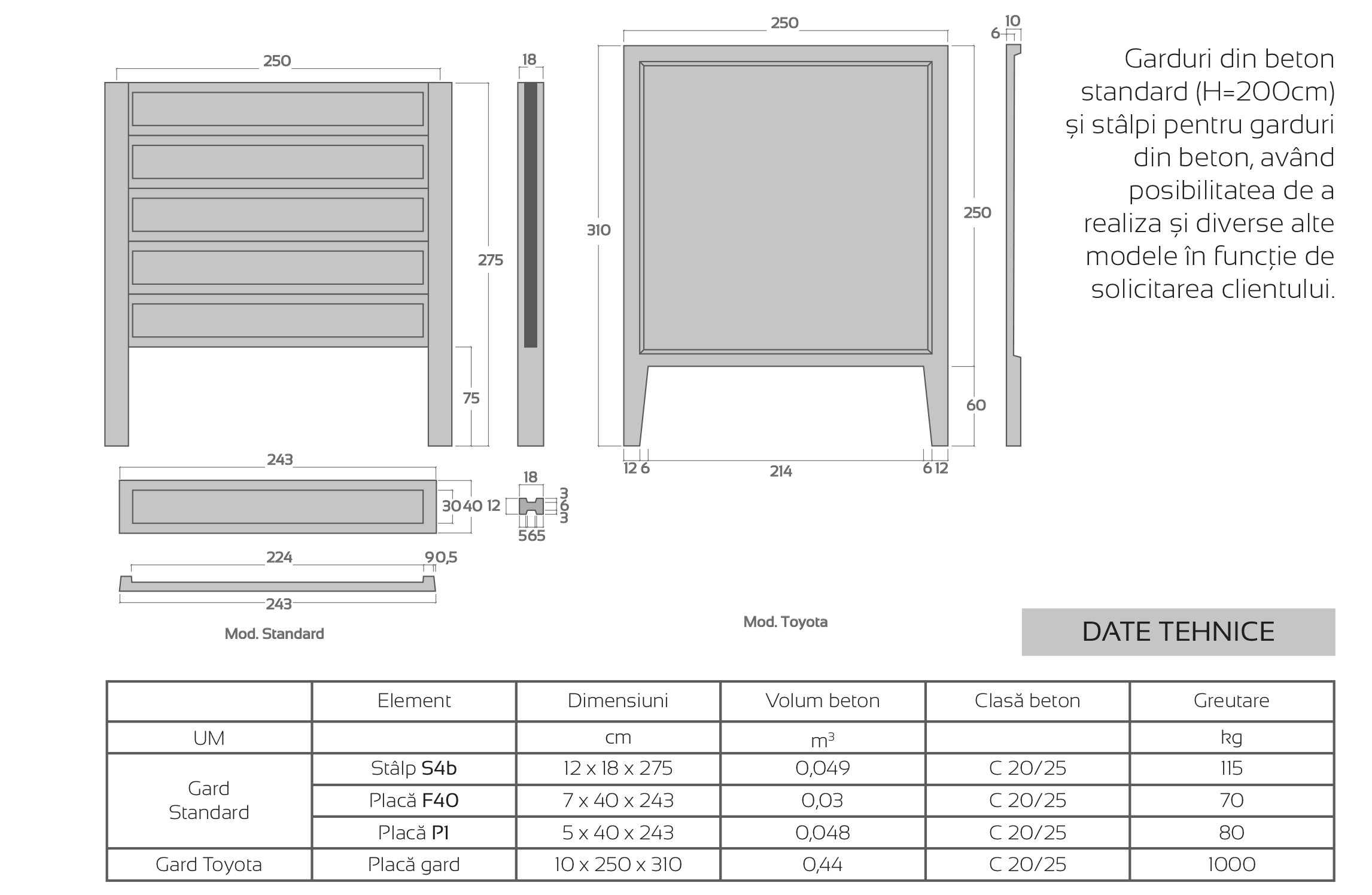 De asemenea, sunt disponibile modele speciale, cum ar fi Gardul Toyota, care utilizează plăci de dimensiuni mai mari (10x250x310 cm), asigurând o soluție de împrejmuire robustă, cu un volum de beton de 0.44 m³.