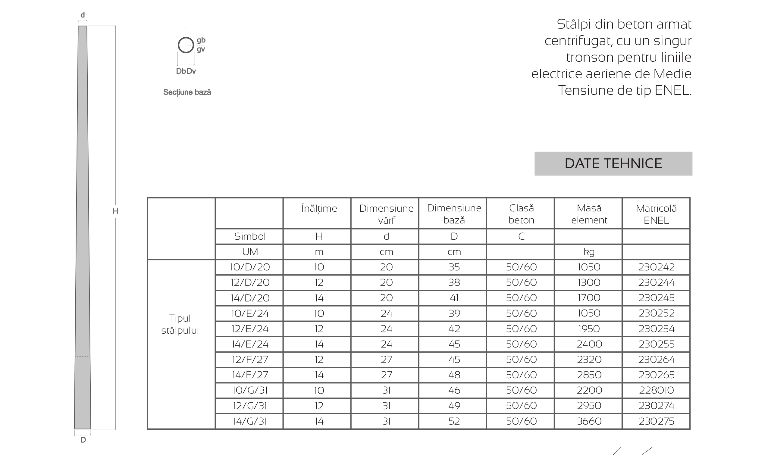 Disponibili în diferite variante de înălțimi (10, 12, și 14 metri) și cu dimensiuni variate la vârf și bază, acești stâlpi sunt concepuți pentru a satisface nevoile de infrastructură electrică pentru medie tensiune. Modelele includ specificații detaliate, cum ar fi diametrul vârfului de la 20 cm la 31 cm și greutăți care variază de la 1050 kg la 2950 kg, în funcție de tipul de stâlp. Matricolele ENEL asigură conformitatea cu standardele specifice companiei pentru asigurarea unei instalări corecte și eficiente.