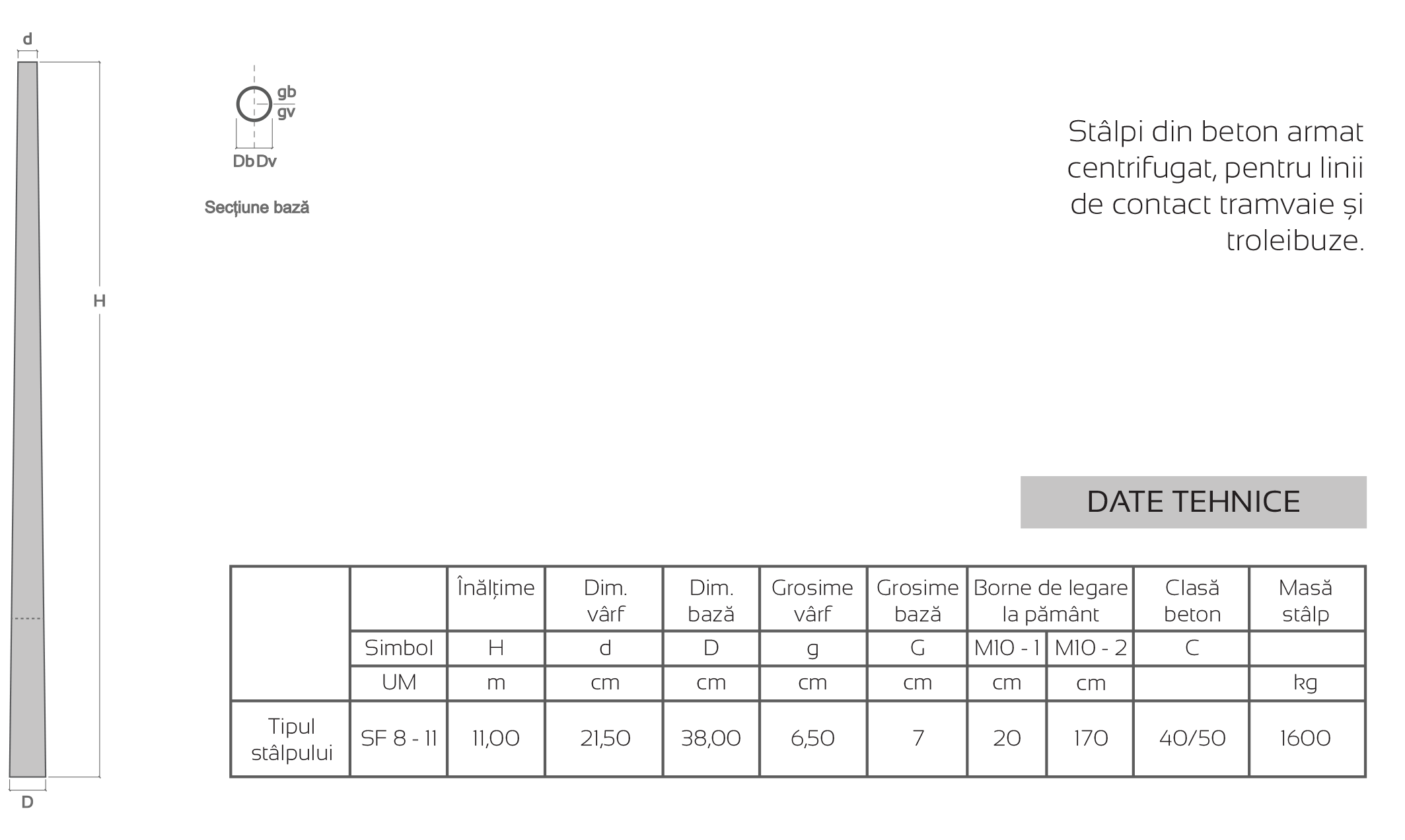 Stâlpii din beton armat centrifugat tip SF 8-11, conform SR EN 12843:2005, sunt special concepuți pentru susținerea liniilor de contact utilizate de tramvaie și troleibuze. Acești stâlpi au o înălțime de 11 metri și sunt fabricați din beton de clasă C40/50, ceea ce le conferă o rezistență ridicată și durabilitate în condiții de utilizare intensă în mediul urban.